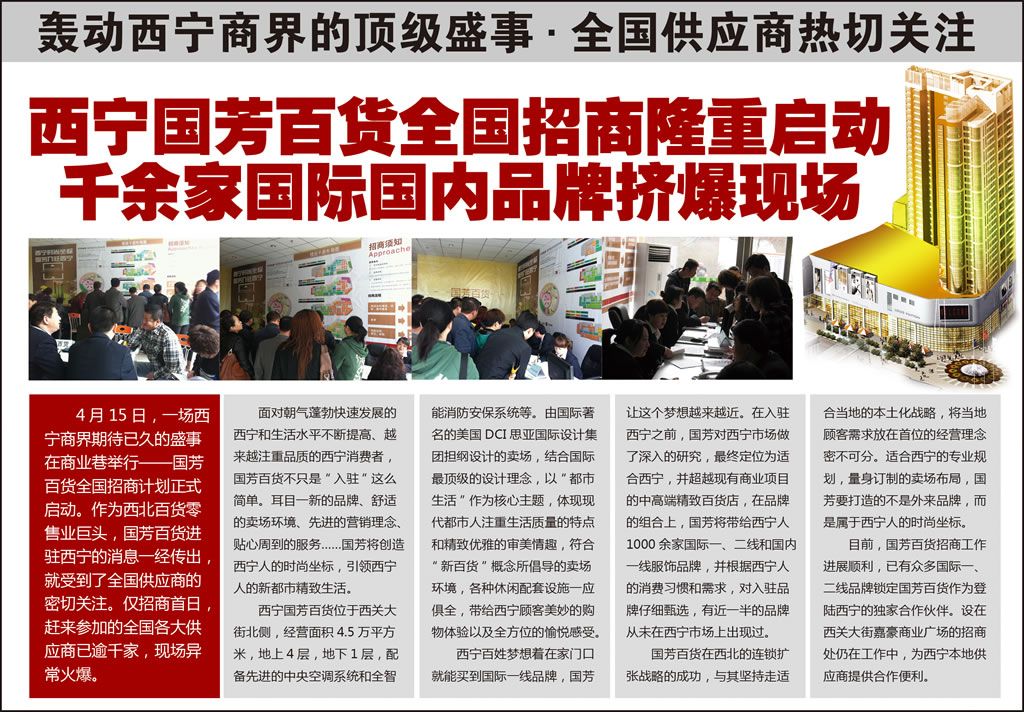 4月15日,一場西寧商界期待已久的盛事在商業(yè)巷舉行——國芳百貨全國招商計劃正式啟動。作為西北百貨零售業(yè)巨頭,國芳百貨進駐西寧的消息一經(jīng)傳出,就受到了全國供應商的密切關(guān)注。僅招商首日,趕來參加的全國各大供應商已逾千家,現(xiàn)場異;鸨。