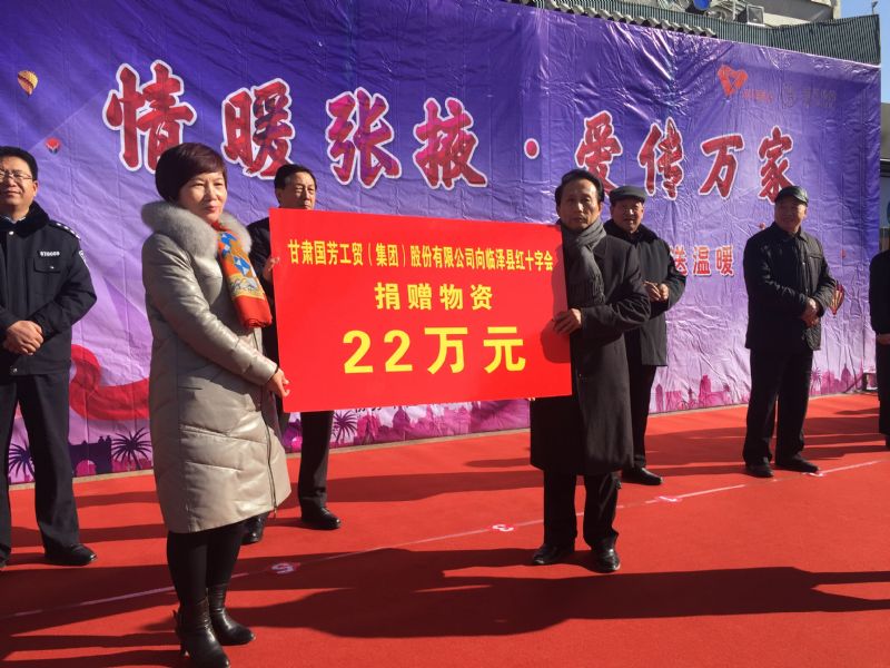 2019年1月11日,甘肅省慈善總會(huì)、張掖市慈善協(xié)會(huì)、甘州區(qū)慈善協(xié)會(huì)以及臨澤縣紅十字會(huì)攜甘肅國(guó)芳工貿(mào)(集團(tuán))股份有限公司在張掖市中心廣場(chǎng)共同舉行“情暖張掖·愛傳萬家”送健康送溫暖活動(dòng),將2000套棉衣,2000余套秋衣秋褲,27臺(tái)彩電以及300余件小家電合計(jì)價(jià)值148萬元的過冬物資帶給山丹縣,民樂縣的困難群眾,將2500個(gè)醫(yī)藥箱帶給臨澤縣的老人們。此次活動(dòng)傳導(dǎo)社會(huì)幫扶、精準(zhǔn)扶貧精神的同時(shí)也默默為社會(huì)傳導(dǎo)著一份正能量。