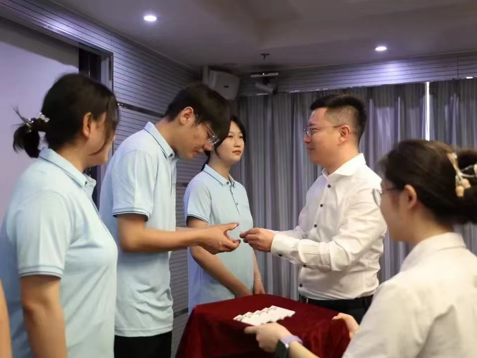 伴隨著激昂的音樂,入職儀式進入了發(fā)放工牌的環(huán)節(jié)。國芳集團各位領(lǐng)導(dǎo)面帶微笑,將蘊含著公司信任與期望的工牌并伴手禮交到新員工手上,工牌在燈光的照耀下,折射出他們堅定的信念和對新征程的信心。